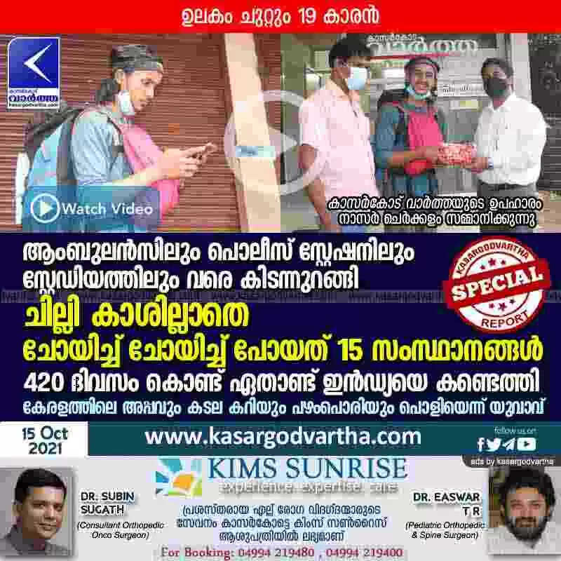 ആംബുലന്സിലും പൊലീസ് സ്റ്റേഷനിലും സ്റ്റേഡിയത്തിലും വരെ കിടന്നുറങ്ങി; ചില്ലി കാശില്ലാതെ ചോയിച്ച് ചോയിച്ച് പോയത് 15 സംസ്ഥാനങ്ങള്; 420 ദിവസം കൊണ്ട് ഏതാണ്ട് ഇന്ഡ്യയെ കണ്ടെത്തി; കേരളത്തിലെ അപ്പവും കടലക്കറിയും പഴംപൊരിയും പൊളിയെന്ന് യുവാവ്