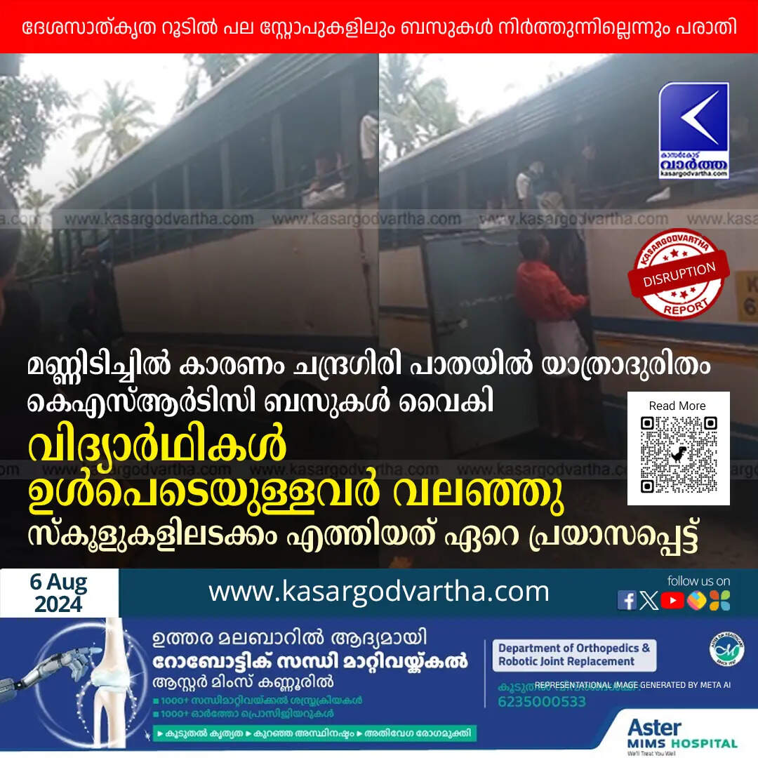 Disruption | മണ്ണിടിച്ചിൽ കാരണം ചന്ദ്രഗിരി പാതയിൽ യാത്രാദുരിതം; കെഎസ്ആർടിസി ബസുകൾ വൈകി; വിദ്യാർഥികൾ ഉൾപെടെയുള്ളവർ വലഞ്ഞു; സ്കൂളുകളിലടക്കം എത്തിയത് ഏറെ പ്രയാസപ്പെട്ട്