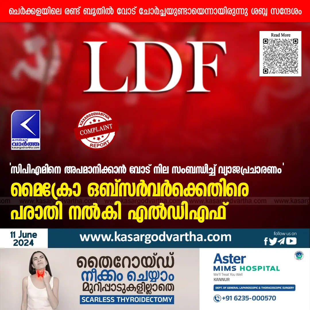 Complaint | 'സിപിഎമിനെ അപമാനിക്കാൻ വോട് നില സംബന്ധിച്ച് വ്യാജപ്രചാരണം'; മൈക്രോ ഒബ്സർവർക്കെതിരെ പരാതി നൽകി എൽഡിഎഫ്