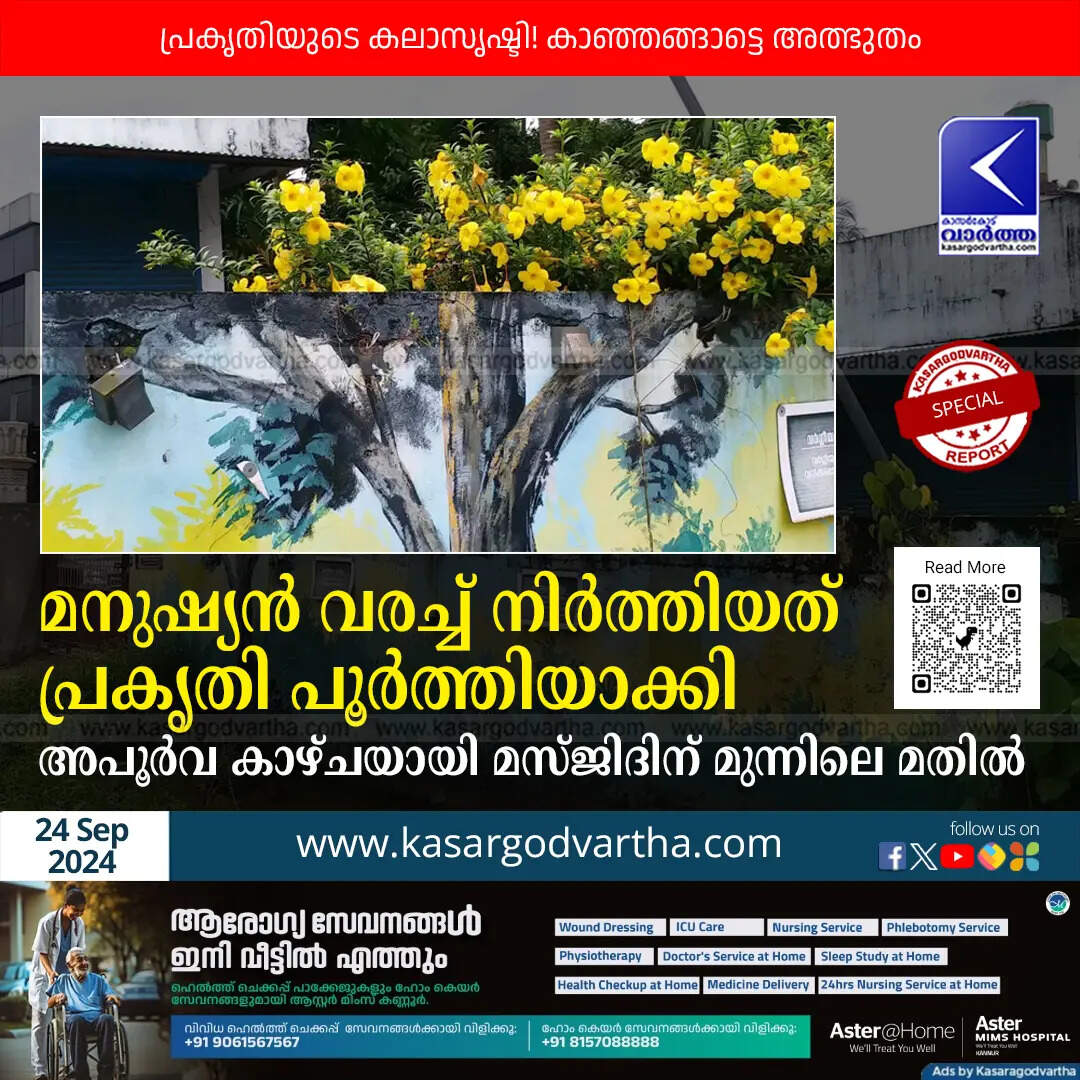 കാഞ്ഞങ്ങാട്: (KasargodVartha) മനുഷ്യന്റെ കലയും പ്രകൃതിയുടെ സൗന്ദര്യവും ഒത്തുചേർന്ന് മസ്ജിദിന്റെ മതിൽ ഒരു വേറിട്ട കലാസൃഷ്ടിയായി മാറി. വർഷങ്ങൾക്ക് മുൻപ് ഒരു ചിത്രകാരൻ പാതിവഴിയിൽ നിർത്തിയ ചിത്രം, പ്രകൃതിയുടെ കരങ്ങളാൽ പൂർത്തിയായി. മതിലിൽ വരച്ച മരച്ചില്ലകളിൽ ഇപ്പോൾ കോളാമ്പിപ്പൂക്കൾ വിരിഞ്ഞിരിക്കുന്നു. കാഞ്ഞങ്ങാട് റെയിൽവേ സ്റ്റേഷന് സമീപം സലഫി മസ്ജിദിന് മുന്നിലാണ് ഈ മനോഹര കാഴ്ച.