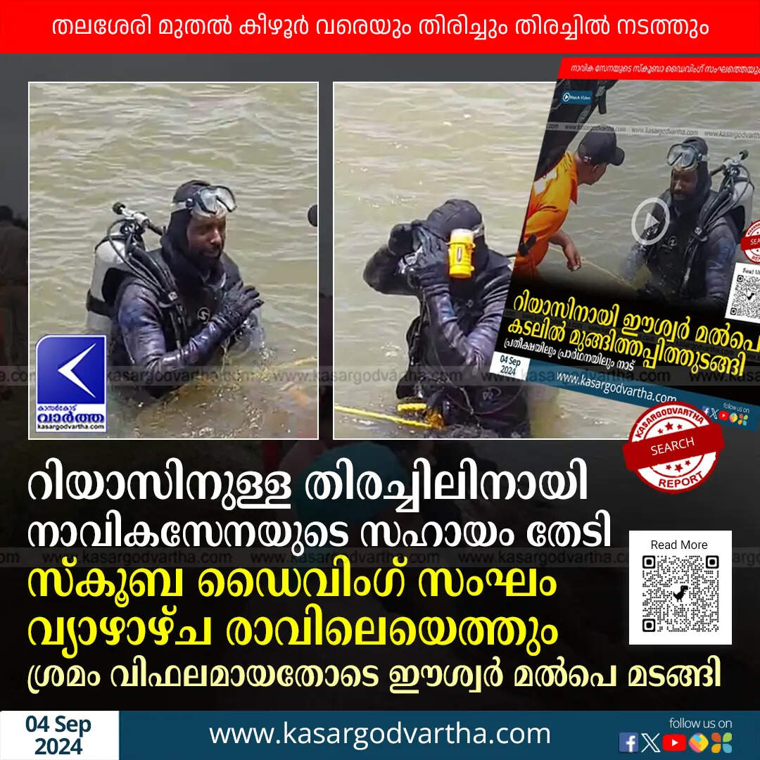 Search | റിയാസിനുള്ള തിരച്ചിലിനായി നാവികസേനയുടെ സഹായം തേടി; സ്കൂബ ഡൈവിംഗ് സംഘം വ്യാഴാഴ്ച രാവിലെയെത്തും; ശ്രമം വിഫലമായതോടെ ഈശ്വർ മൽപെ മടങ്ങി