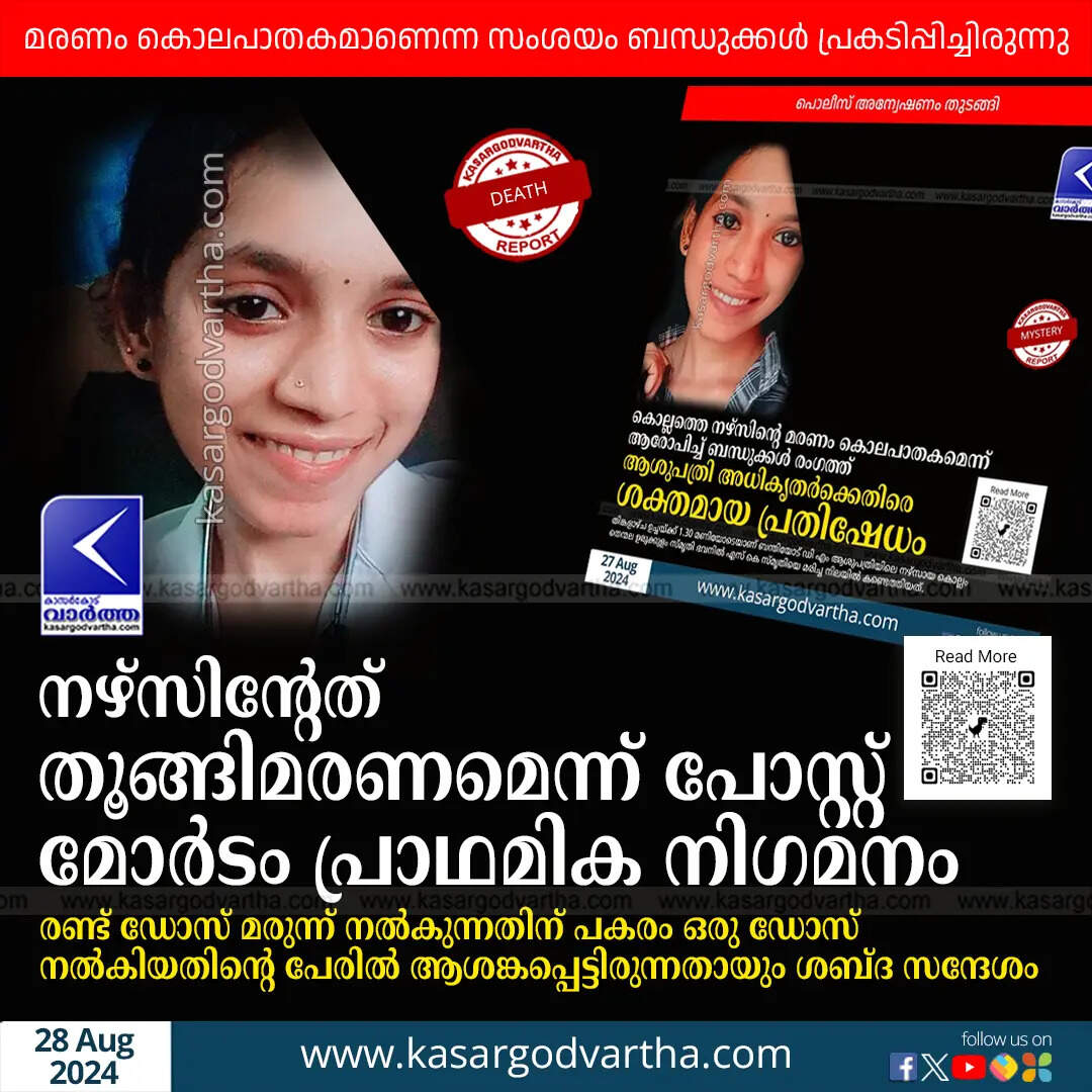 Death | നഴ്സിന്റേത് തൂങ്ങിമരണമെന്ന് പോസ്റ്റ് മോർടം പ്രാഥമിക നിഗമനം; രണ്ട് ഡോസ് മരുന്ന് നൽകുന്നതിന് പകരം ഒരു ഡോസ് നൽകിയതിന്റെ പേരിൽ ആശങ്കപ്പെട്ടിരുന്നതായും ശബ്ദ സന്ദേശം