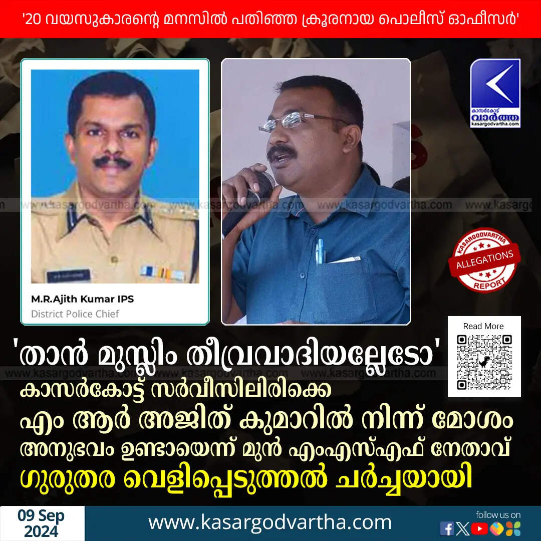 Allegations | 'താൻ മുസ്ലിം തീവ്രവാദിയല്ലേടോ'; കാസർകോട്ട് സർവീസിലിരിക്കെ എം ആർ അജിത് കുമാറിൽ നിന്ന് മോശം അനുഭവം ഉണ്ടായെന്ന് മുൻ എംഎസ്എഫ് നേതാവ്; ഗുരുതര വെളിപ്പെടുത്തൽ ചർച്ചയായി