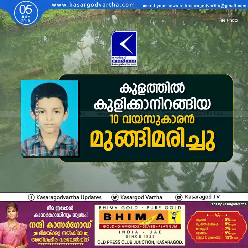 Keywords: Kerala, kasaragod, news, Drown, Death, Student, Top-Headlines, 10 year old boy drowned to death