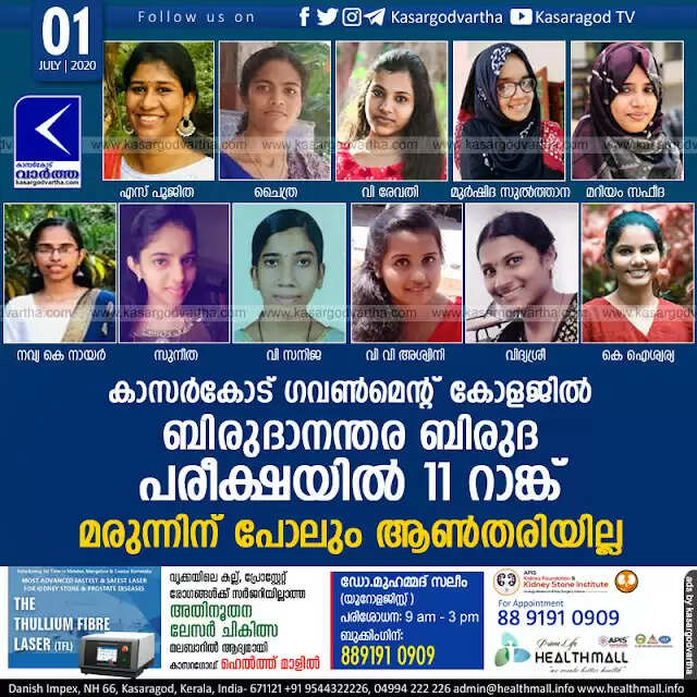 കാസര്‍കോട് ഗവണ്‍മെന്റ് കോളജില്‍ ബിരുദാനന്തര ബിരുദ പരീക്ഷയില്‍ 11 റാങ്ക്; മരുന്നിന് പോലും ആണ്‍തരിയില്ല