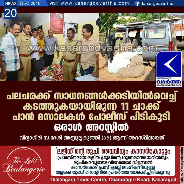 പലചരക്ക് സാധനങ്ങള്ക്കടിയില്വെച്ച് കടത്തുകയായിരുന്ന 11 ചാക്ക് പാന് മസാലകള് പോലീസ് പിടികൂടി; ഒരാള് അറസ്റ്റില്