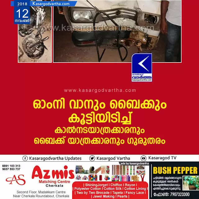 ഓംനി വാനും ബൈക്കും കൂട്ടിയിടിച്ച് കാല്നടയാത്രക്കാരനും ബൈക്ക് യാത്രക്കാരനും ഗുരുതരം