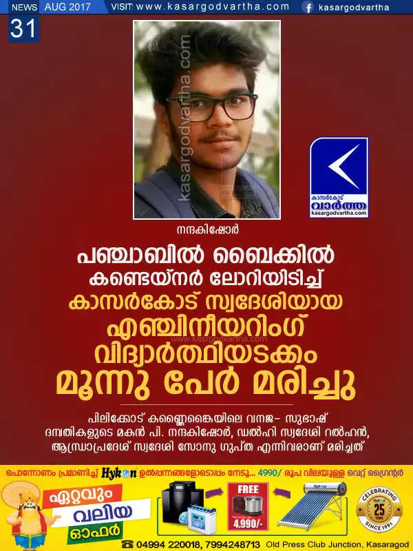 പഞ്ചാബില് ബൈക്കില് കണ്ടെയ്നര് ലോറിയിടിച്ച് കാസര്കോട് സ്വദേശിയായ എഞ്ചിനീയറിംഗ് വിദ്യാര്ത്ഥിയടക്കം മൂന്നു പേര് മരിച്ചു