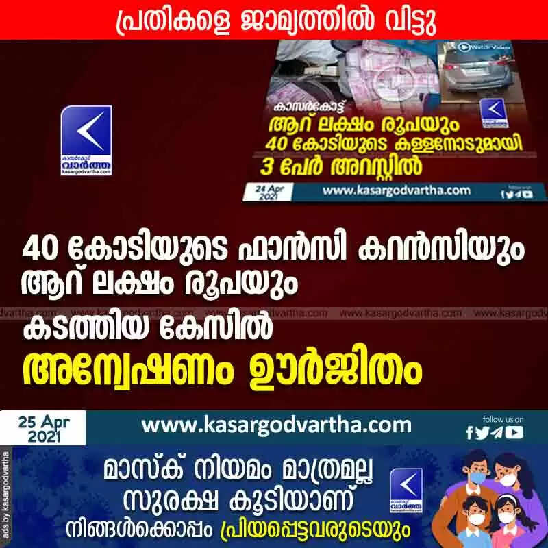 40 കോടിയുടെ ഫാന്സി കറന്സിയും ആറ് ലക്ഷം രൂപയും കടത്തിയ കേസില് അന്വേഷണം ഊര്ജിതം; പ്രതികളെ ജാമ്യത്തില് വിട്ടു