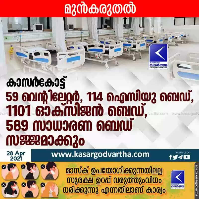 കാസർകോട്ട് 59 വെൻ്റിലേറ്റർ, 114 ഐ സി യു ബെഡ്, 1101 ഓക്സിജൻ ബെഡ്, 589 സാധാരണ ബെഡ് സജ്ജമാക്കും