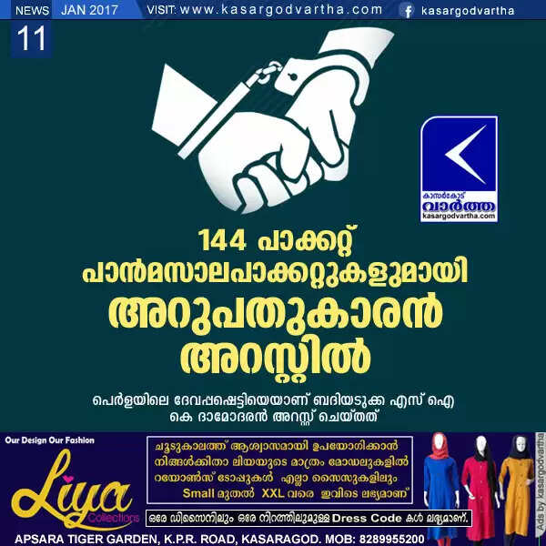 Keywords:  Badiyadukka, Kasaragod, Arrest, Panmasala, 60 year old arrested with 144 packet panmasala
