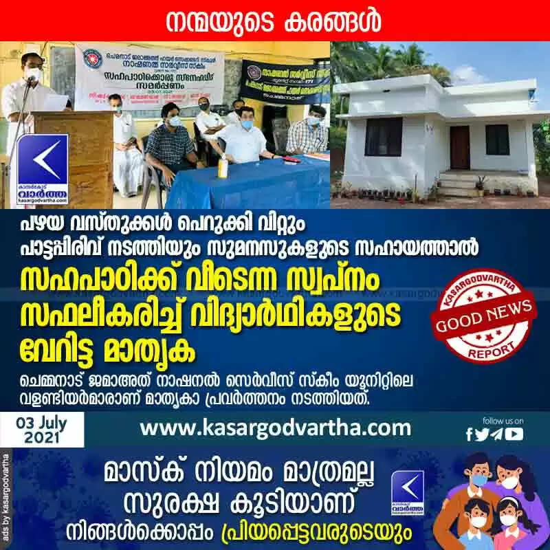 ചെമ്മനാട്: (www.kasargodvartha.com 03.07.2021) ലോക് ഡൗണിൽ ലോകം മുഴുവൻ നിശ്ചലമായ സാമ്പത്തിക മാന്ദ്യത്തിനിടയിലും വീട്ടിലെ പഴയ വസ്തുക്കൾ പെറുക്കി വിറ്റും പാട്ടപ്പിരിവ് നടത്തിയും സുമനസുകളുടെ സഹായത്താൽ വീട് നിർമിച്ചു സഹപാഠികളുടെ സാന്ത്വന കൈനീട്ടം. ചെമ്മനാട് ജമാഅത് നാഷനൽ സെർവീസ് സ്കീം യൂനിറ്റിലെ വളണ്ടിയർമാരാണ് മാതൃകാ പ്രവർത്തനം നടത്തിയത്. സ്നേഹവീടിന്റെ താക്കോൽ ഉദുമ എംഎൽഎ അഡ്വ. സി എച് കുഞ്ഞമ്പു കൈമാറി.