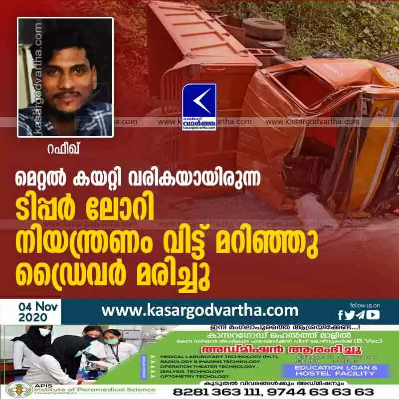 ബദിയടുക്ക: (www.kasargodvartha.com 04.11.2020) മെറ്റൽ കയറ്റി വരികയായിരുന്ന ടിപ്പർ ലോറി നിയന്ത്രണം വിട്ട് മറിഞ്ഞു. അപകടത്തിൽ ഡ്രൈവർ മരിച്ചു. ബെള്ളൂർ പള്ളപ്പാടിയിലെ മുഹമ്മദിൻ്റെ മകൻ റഫീഖ് (33) ആണ് മരിച്ചത്. ബുധനാഴ്ച ഉച്ചയ്ക്ക് ഒരു മണിയോടെ വിട്ട്ളയ്ക്കടുത്ത് പുളച്ചയിലാണ് അപകടം. കൂടെയുണ്ടായിരുന്ന സഹായി പള്ളപ്പാടിയിലെ അശ്റഫ് (32) പരിക്കുകളോടെ രക്ഷപ്പെട്ടു.