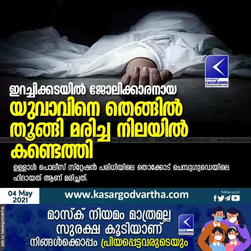 ചട്ടഞ്ചാൽ: (www.kasargodvartha.com 04.05.2021) ഇറച്ചിക്കടയിൽ ജോലിക്കാരനായ യുവാവിനെ തെങ്ങിൽ തൂങ്ങി മരിച്ച നിലയിൽ കണ്ടെത്തി. ഉള്ളാൾ പൊലീസ് സ്റ്റേഷൻ പരിധിയിലെ തൊക്കോട് ചെമ്പുഗുഡെയിലെ ഹിദായത് (25) ആണ് മരിച്ചത്.
