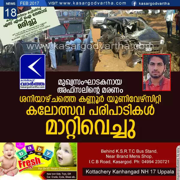 Keywords: Kasaragod, Afsal, Nullippady, Accident, Vidya Nagar, SFI, Leader, Afsal deathL: Kannur University Kalolsavam postponed