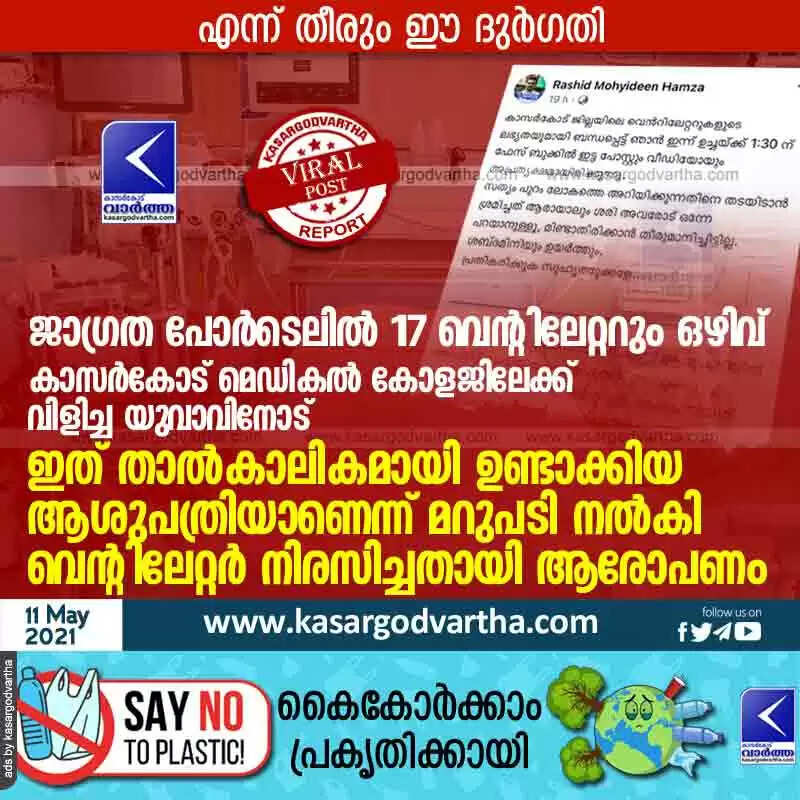 Keywords: Kasaragod, Kerala, News, Social-Media, Top-Headlines, Hospital, Medical College, Secretary, Allegation that ventilator refused when young man called Kasargod Medical College. < !- START disable copy paste -->