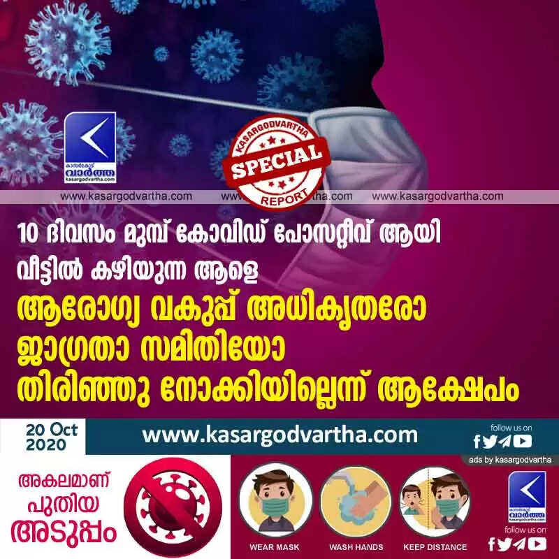 കാസര്‍കോട്: (www.kasargodvartha.com 20.10.2020) 10 ദിവസം മുമ്പ് കോവിഡ് പോസറ്റീവ് ആയി വീട്ടില്‍ കഴിയുന്ന ആളെ ആരോഗ്യ വകുപ്പ് അധികൃതരോ ജാഗ്രതാ സമിതി പ്രവര്‍ത്തകരോ തിരിഞ്ഞു പോലും നോക്കിയില്ലെന്ന് ആഷേപം.