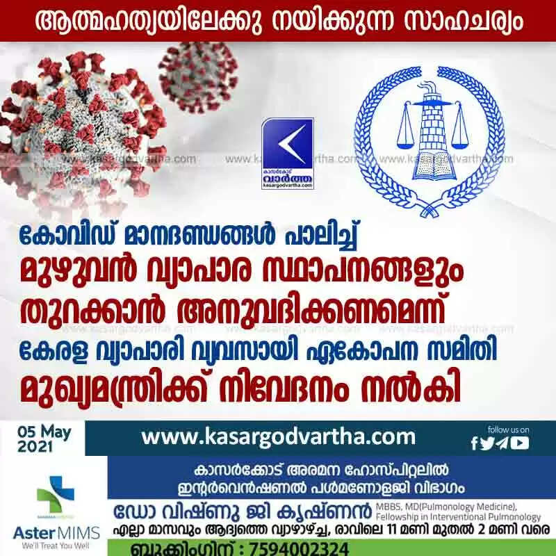 Keywords: Kasaragod, Kerala, News, Top-Headlines, COVID-19, Corona, Pinarayi-Vijayan, Allow to open all shops with the Covid protocol, says vyapari vyavasayi ekopana samithi.