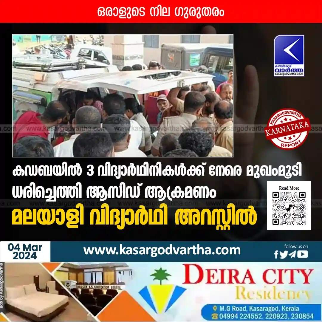 Attack | ദക്ഷിണ കന്നഡയിൽ 3 വിദ്യാർഥിനികൾക്ക് നേരെ മുഖംമൂടി ധരിച്ചെത്തി ആസിഡ് ആക്രമണം; ഒരാളുടെ നില ഗുരുതരം; മലയാളി വിദ്യാർഥി അറസ്റ്റിൽ