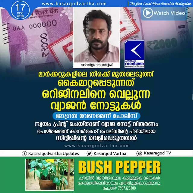 മാര്ക്കറ്റുകളിലെ തിരക്ക് മുതലെടുത്ത് കൈമാറ്റപ്പെടുന്നത് ഒറിജിനലിനെ വെല്ലുന്ന വ്യാജന് നോട്ടുകള്; ജാഗ്രത വേണമെന്ന് പോലീസ്, സ്വയം പ്രിന്റ് ചെയ്താണ് വ്യാജ നോട്ട് വിതരണം ചെയ്തതെന്ന് കാസര്കോട് പോലീസിന്റെ പിടിയിലായ സിദ്ദീഖിന്റെ വെളിപ്പെടുത്തല്