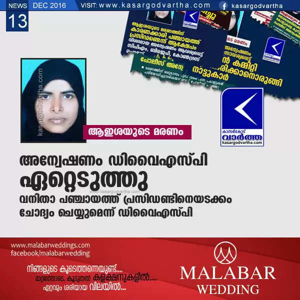 ആഇശയുടെ മരണം: അന്വേഷണം ഡിവൈഎസ്പി ഏറ്റെടുത്തു, വനിതാ പഞ്ചായത്ത് പ്രസിഡണ്ടിനെയടക്കം ചോദ്യം ചെയ്യുമെന്ന് ഡിവൈഎസ്പി