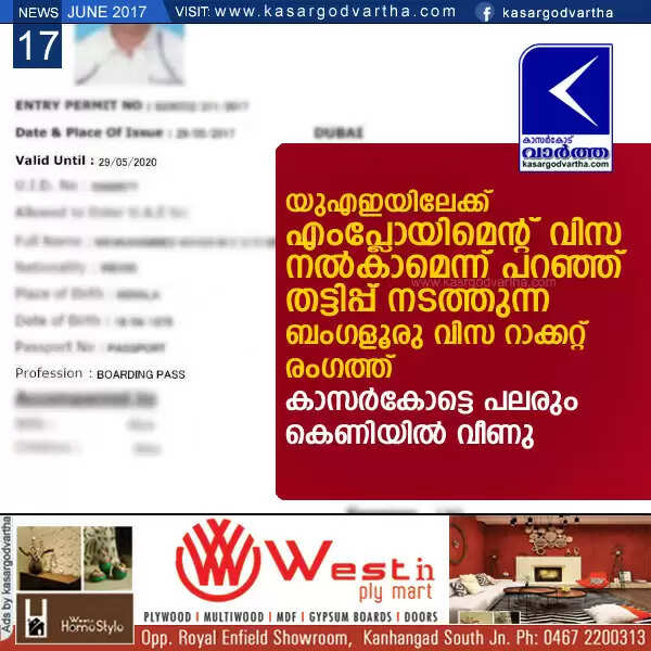 യുഎഇയിലേക്ക് എംപ്ലോയിമെന്റ് വിസ നല്കാമെന്ന് പറഞ്ഞ് തട്ടിപ്പ് നടത്തുന്ന ബംഗളൂരു വിസ റാക്കറ്റ് രംഗത്ത്; കാസര്കോട്ടെ പലരും കെണിയില് വീണു