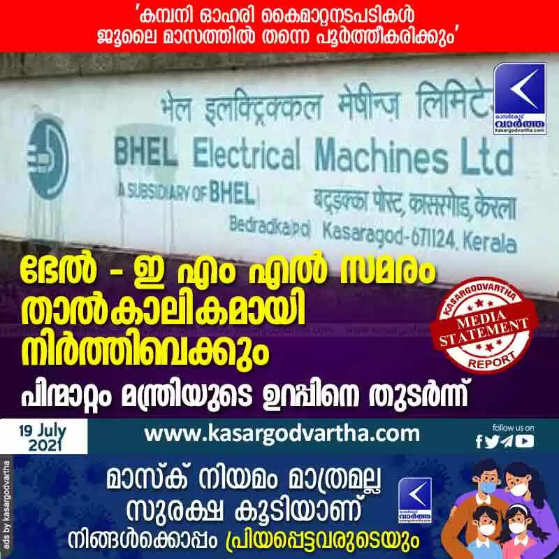 Keywords: Kerala, News, Kasaragod, Protest, Strike, Minister, Employees, Top-Headlines, Stopped, BHEL EML strike will be suspended.