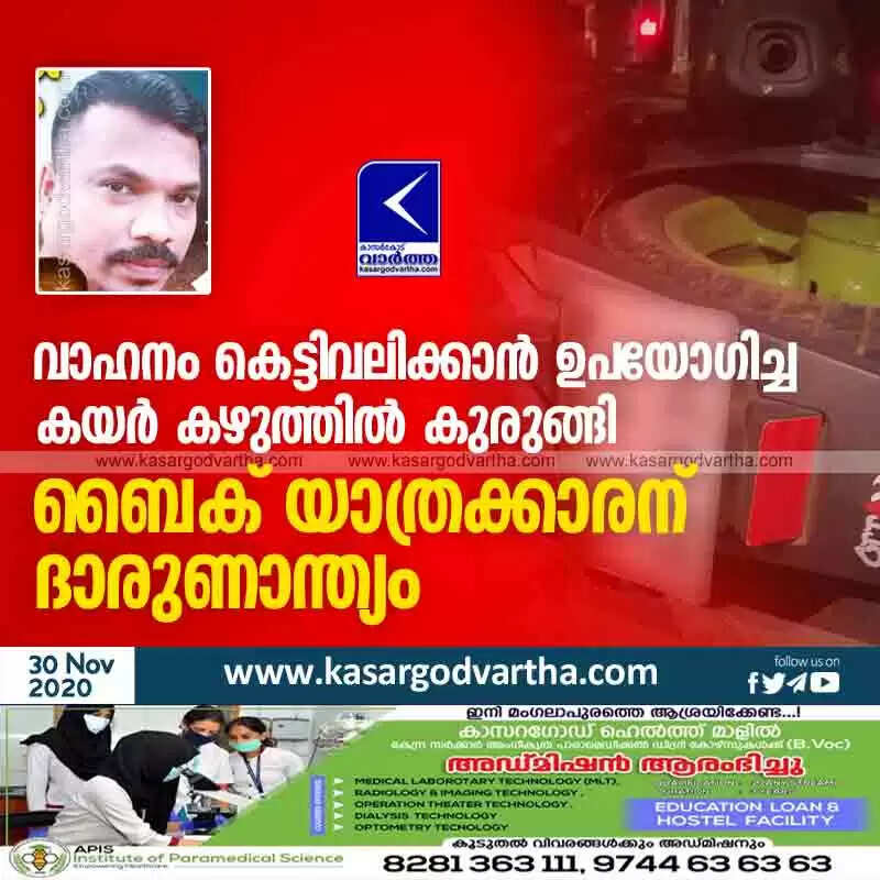 വാഹനം കെട്ടിവലിക്കാന് ഉപയോഗിച്ച കയര് കഴുത്തില് കുരുങ്ങി ബൈക് യാത്രക്കാരന് ദാരുണാന്ത്യം