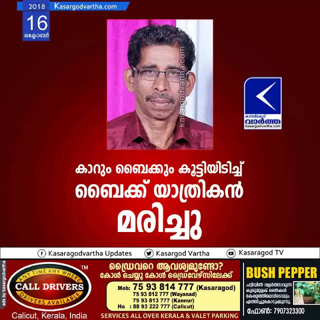 Keywords:  Kerala, Nileshwaram, news, Car, Bike, Accident, Death, Bike rider dies in accident