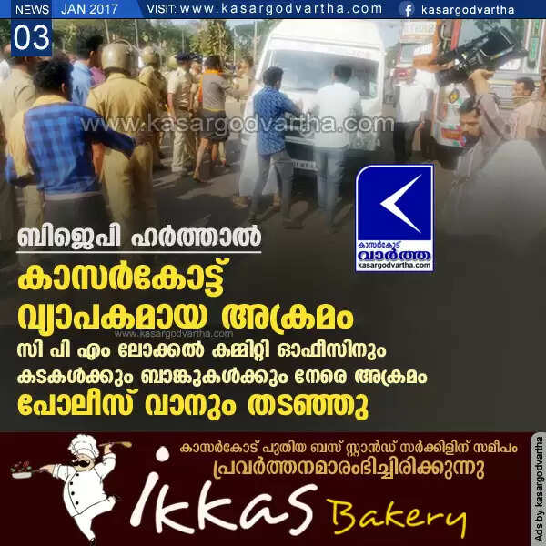 ഹര്ത്താലിനോടനുബന്ധിച്ച് കാസര്കോട്ട് വ്യാപകമായ അക്രമം; സി പി എം ലോക്കല് കമ്മിറ്റി ഓഫീസിനും കടകള്ക്കും ബാങ്കുകള്ക്കും നേരെ അക്രമം, പോലീസ് വാനും തടഞ്ഞു