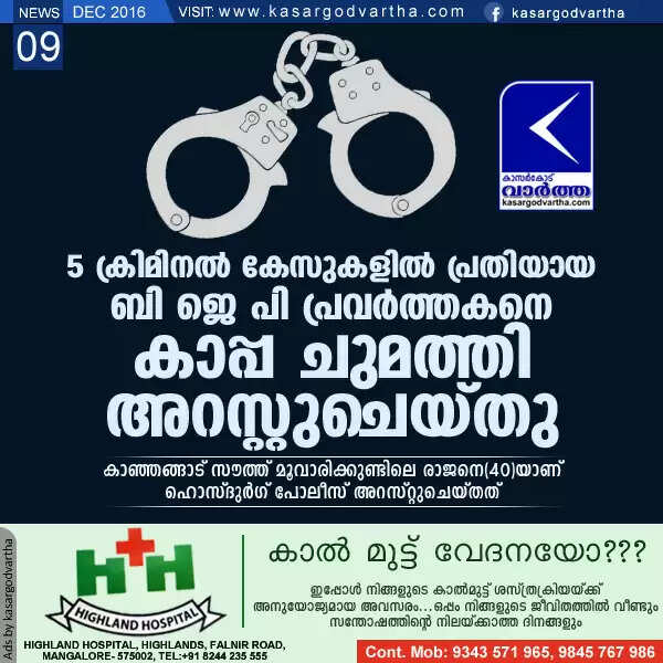 Keywords:  Kanhangad, Arrest, Kasaragod, Kerala, BJP, KAPPA, BJP Worker, BJP volunteer arrested under KAPPA