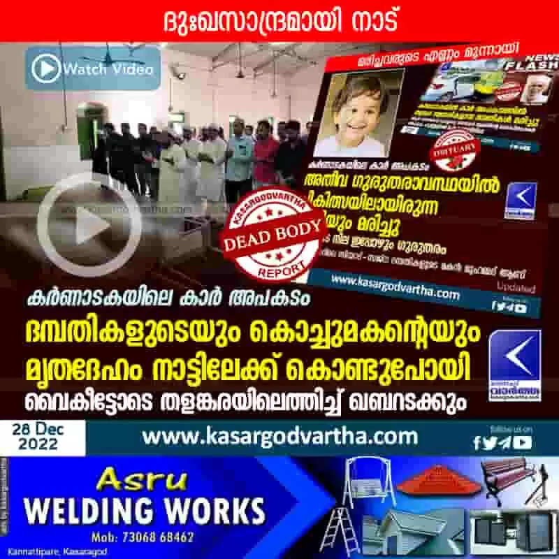 Dead bodies | കർണാടകയിലെ കാർ അപകടം: ദമ്പതികളുടെയും കൊച്ചുമകന്റെയും മൃതദേഹം നാട്ടിലേക്ക് കൊണ്ടുപോയി; വൈകീട്ടോടെ തളങ്കരയിലെത്തും; ദുഃഖസാന്ദ്രമായി നാട്