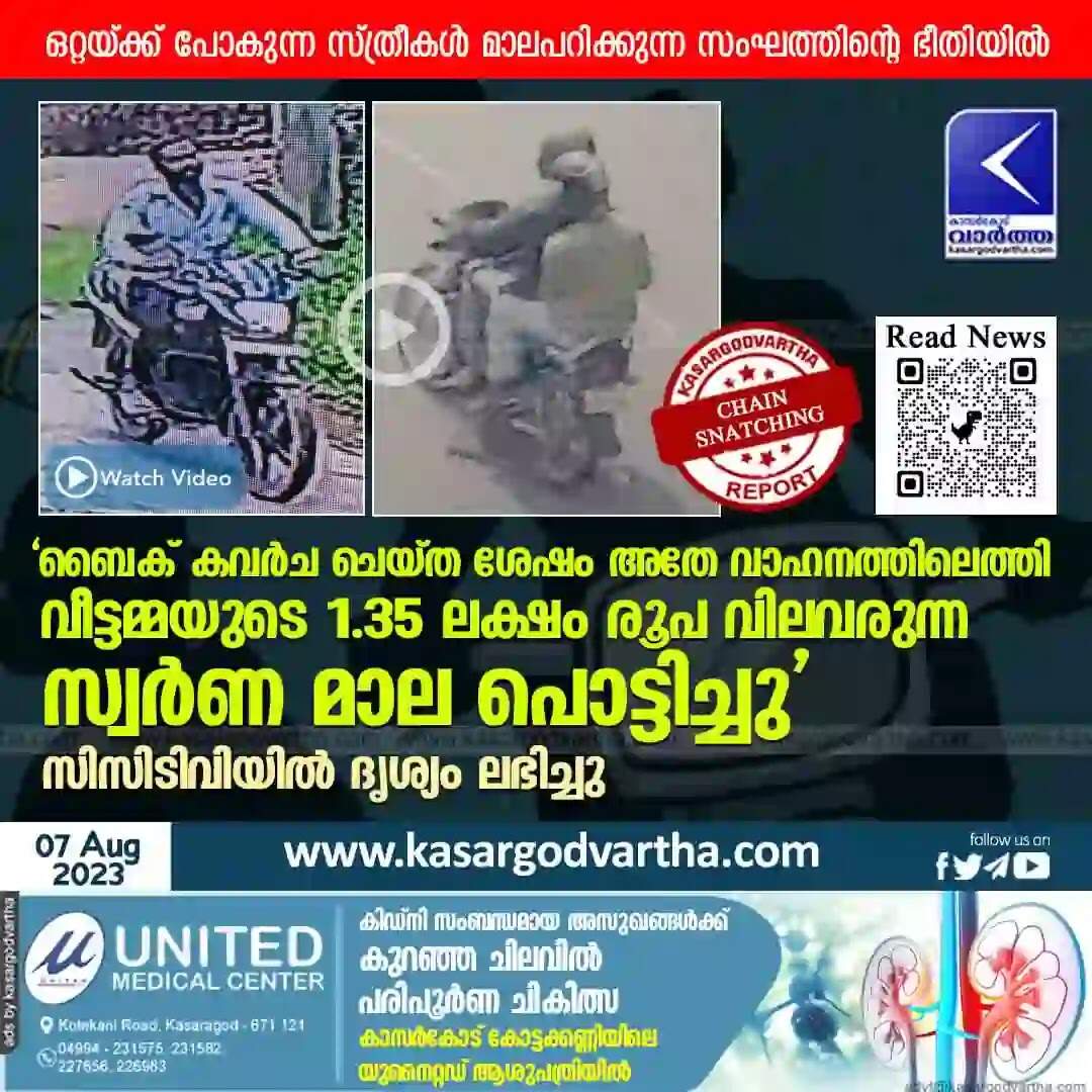 ബേക്കൽ പെരിയാട്ടടുക്കത്ത് വെച്ച് ഞായറാഴ്ച രാവിലെ 11.45 മണിയോടെ പെയിന്റ് കടയുടെ മുന്നിൽ നിർത്തിയിട്ടിരുന്ന കുണിയയിലെ മൊയ്തുവിന്റെ ബൈക് കവർച ചെയ്ത ശേഷമാണ് പ്രതികൾ മാലമോഷണത്തിന് ഇറങ്ങിയതെന്ന് പൊലീസ് വ്യക്തമാക്കി. നീല കുപ്പായം ധരിച്ച ഒരാൾ ബൈക് ഓടിച്ച് പോവുന്നതിന്റെ സിസിടിവി ദൃശ്യം പൊലീസിന് ലഭിച്ചിട്ടുണ്ട്.