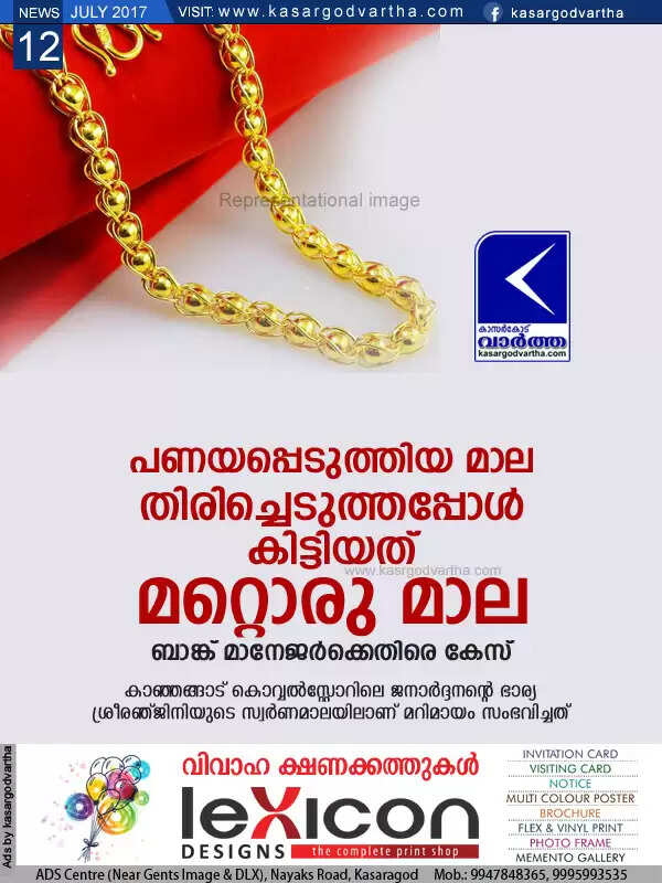 പണയപ്പെടുത്തിയ മാല തിരിച്ചെടുത്തപ്പോള്‍ കിട്ടിയത് മറ്റൊരു മാല; ബാങ്ക് മാനേജര്‍ക്കെതിരെ കേസ്