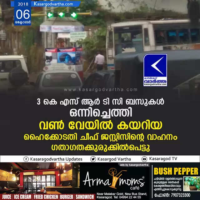 3 കെ എസ് ആര്‍ ടി സി ബസുകള്‍ ഒന്നിച്ചെത്തി; വണ്‍ വേയില്‍ കയറിയ ഹൈക്കോടതി ചീഫ് ജസ്റ്റിസിന്റെ വാഹനം ഗതാഗതക്കുരുക്കില്‍പെട്ടു