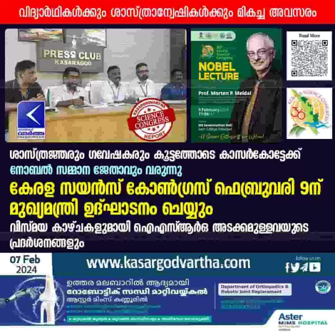 Science Congress | ശാസ്ത്രജ്ഞരും ഗവേഷകരും കൂട്ടത്തോടെ കാസർകോട്ടേക്ക്; നോബൽ സമ്മാന ജേതാവും വരുന്നു; കേരള സയൻസ് കോണ്‍ഗ്രസ് ഫെബ്രുവരി 9ന് മുഖ്യമന്ത്രി ഉദ്ഘാടനം ചെയ്യും; വിദ്യാർഥികൾക്കും ശാസ്ത്രാന്വേഷികൾക്കും മികച്ച അവസരം; വിസ്മയ കാഴ്ചകളുമായി ഐഎസ്‌ആർഒ അടക്കമുള്ളവയുടെ പ്രദർശനങ്ങളും
