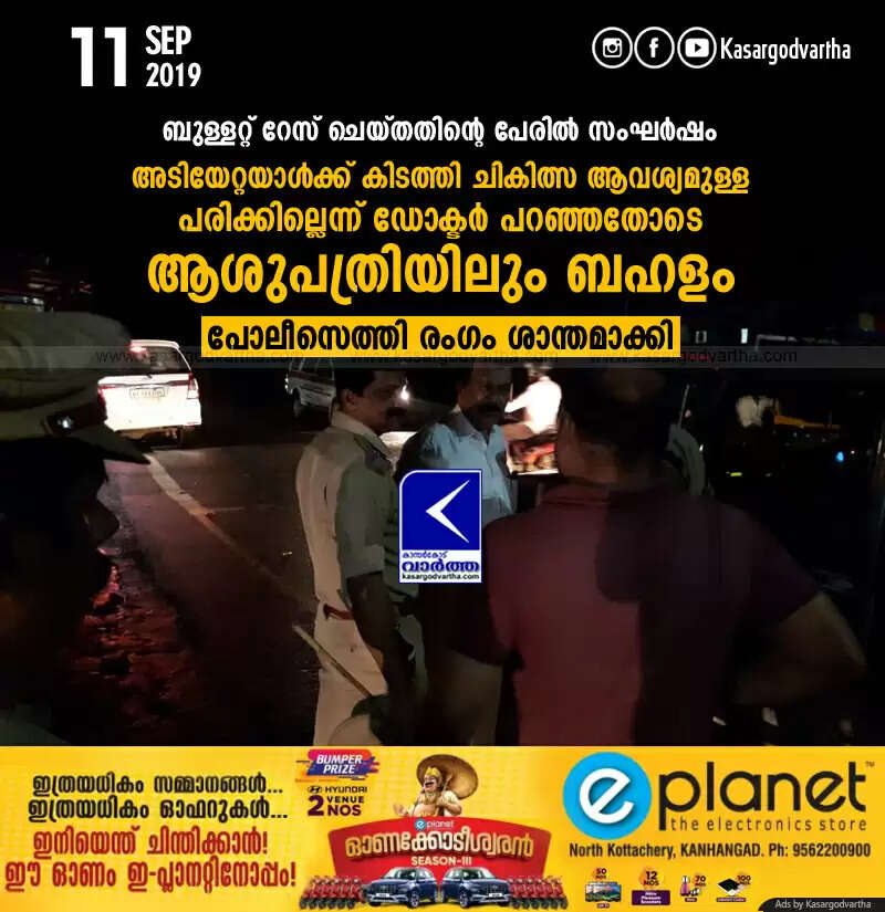 ബുള്ളറ്റ് റേസ് ചെയ്തതിന്റെ പേരില്‍ സംഘര്‍ഷം: അടിയേറ്റയാള്‍ക്ക് കിടത്തി ചികിത്സ ആവശ്യമുള്ള പരിക്കില്ലെന്ന് ഡോക്ടര്‍ പറഞ്ഞതോടെ ആശുപത്രിയിലും ബഹളം, പോലീസെത്തി രംഗം ശാന്തമാക്കി