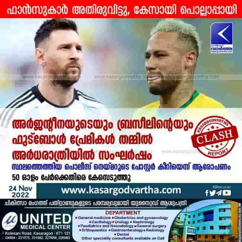 Police Booked | അര്ജന്റീനയുടെയും ബ്രസീലിന്റെയും ഫുട്ബോള് പ്രേമികള് തമ്മില് അര്ധരാത്രിയില് സംഘര്ഷം; സ്ഥലത്തെത്തിയ പൊലീസ് നെയ്മറുടെ പോസ്റ്റര് കീറിയെന്ന് ആരോപണം; 50 ഓളം പേര്ക്കെതിരെ കേസെടുത്തു
