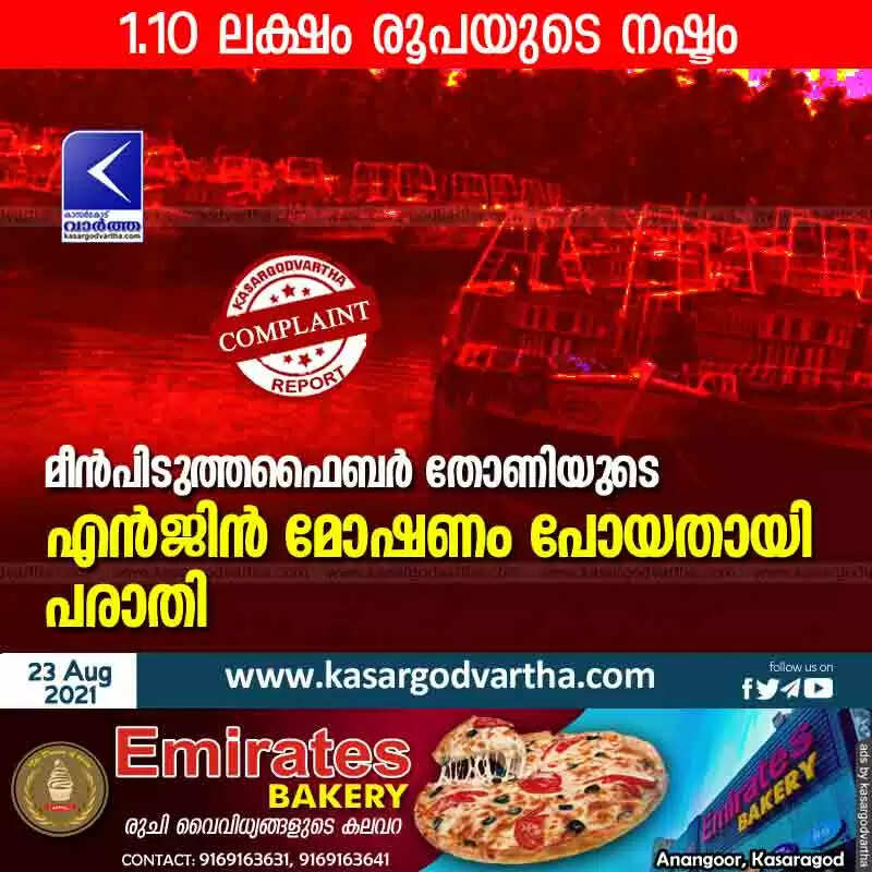 Keywords: News, Complaint, Boat, Robbery, Case, Kasaragod, Cash, Police, Investigation, Top-Headlines, Complaint that engine of fiber boat stolen.