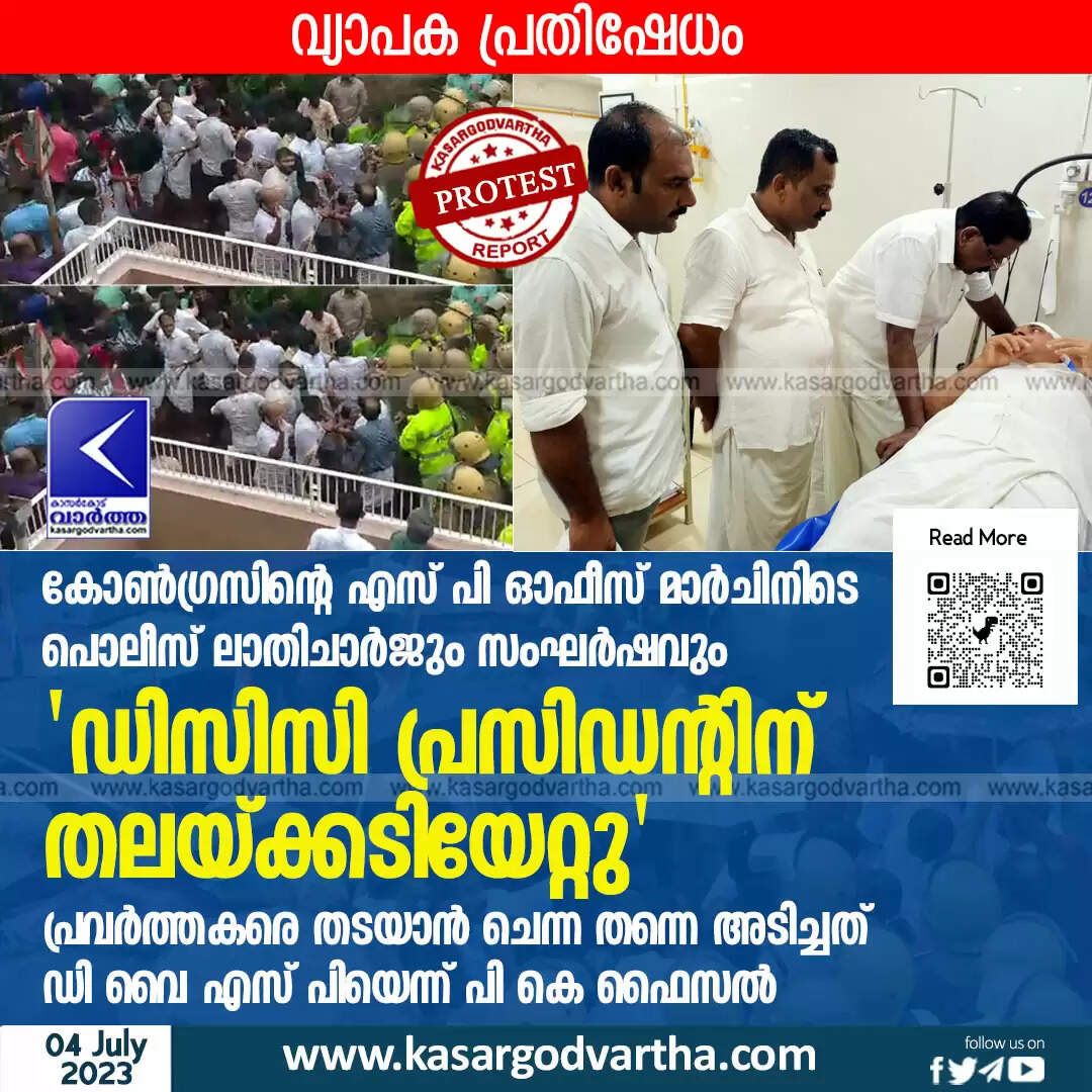 Keywords: Congress, DCC, KPCC, Police, DYSP, Rajmohan Unnithan, SP Office, K Sudhakaran, PK Faizal, Congress workers injured in clash with police during protest.