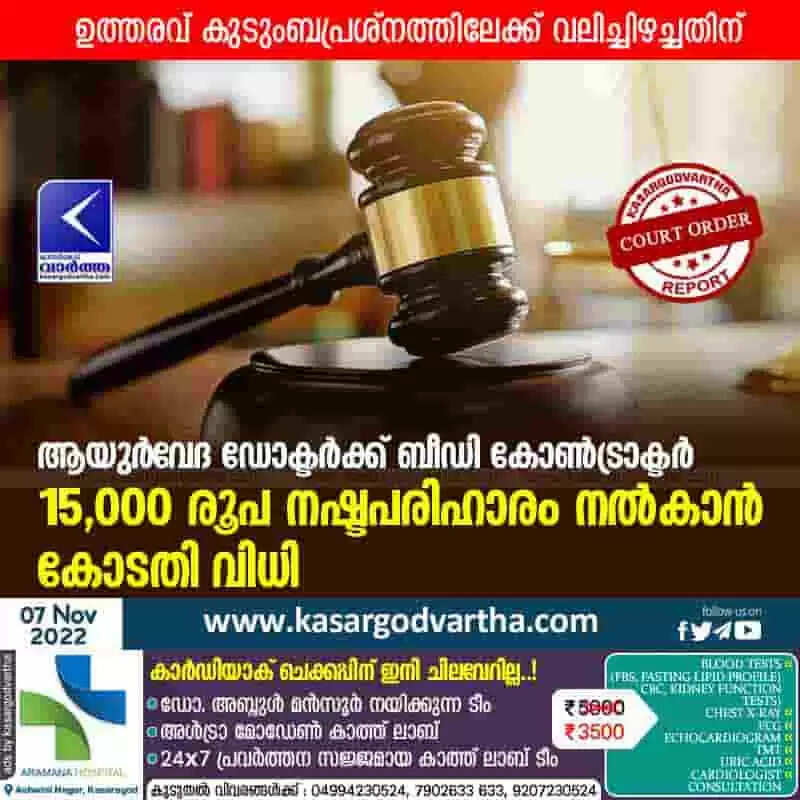 Keywords: Court orders beedi contractor to pay Rs 15,000 as compensation to Ayurveda doctor, Kasaragod,News,Top-Headlines,court order,Doctor, Compensation.