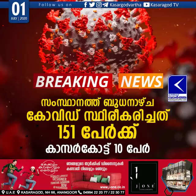 തിരുവനന്തപുരം: (www.kasargodvartha.com 01.07.2020) സംസ്ഥാനത്ത് ബുധനാഴ്ച കോവിഡ് സ്ഥിരീകരിച്ചത് 151 പേര്‍ക്ക്. ഇതില്‍ 10 പേര്‍ കാസര്‍കോട്ടാണ്. മലപ്പുറം- 34, കണ്ണൂര്‍ -27, പാലക്കാട്- 17, തൃശൂര്‍- 18, എറണാകുളം- 12, ആലപ്പുഴ- 8, പത്തനംതിട്ട- 6, കോഴിക്കോട് -6, തിരുവനന്തപുരം -4, കൊല്ലം- 3, വയനാട്- 3, കോട്ടയം- 4, ഇടുക്കി- 1 എന്നിങ്ങനെയാണ് മറ്റു ജില്ലകളിലാണ് പോസിറ്റീവ് കണക്കുകള്‍. രോഗം ബാധിച്ചതില്‍ 86 പേര്‍ വിദേശത്ത് നിന്ന് വന്നതാണ്, മറ്റു സംസ്ഥാനങ്ങളില്‍നിന്ന് 81 പേര്‍. സമ്പര്‍ക്കം വഴി 13 പേര്‍.