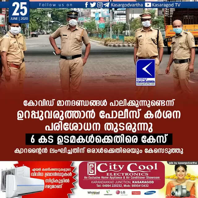 കോവിഡ് മാനദണ്ഡങ്ങള്‍ പാലിക്കുന്നുണ്ടെന്ന് ഉറപ്പുവരുത്താന്‍ പോലീസ് കര്‍ശന പരിശോധന തുടരുന്നു; 6 കട ഉടമകള്‍ക്കെതിരെ കേസ്, ക്വാറന്റൈന്‍ ലംഘിച്ചതിന് ഒരാള്‍ക്കെതിരെയും കേസെടുത്തു