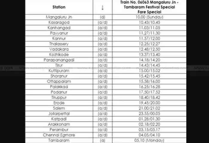 മംഗ്ളുറു-താംബരം (06063) ട്രെയിൻ നവംബർ 12, 19, 26 തീയതികളിൽ രാവിലെ 10 മണിക്ക് മംഗ്ളൂറിൽ നിന്ന് പുറപ്പെടും. കാസർകോട് (10.43), കാഞ്ഞങ്ങാട് (11.03) എന്നിവിടങ്ങളിലും സ്റ്റോപ് ഉണ്ടാകും. താംബരത്ത് തിങ്കളാഴ്ച രാവിലെ 5.10-ന് എത്തിച്ചേരും.