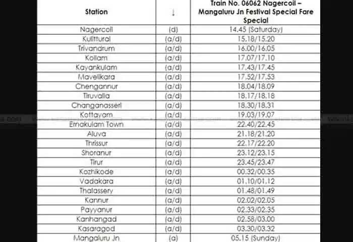 നാഗർകോവിൽ - മംഗ്ളുറു ജൻക്ഷൻ ട്രെയിൻ (06062) നവംബർ 11, 18, 25 തീയതികളിൽ (മൂന്ന് സർവീസ്) നാഗര്‍കോവില്‍ ജൻക്ഷനില്‍നിന്ന് ഉച്ചയ്ക്കു ശേഷം 2.45ന് പുറപ്പെടും. പിറ്റേദിവസം രാവിലെ 5.15-ന് മംഗ്ളൂറിൽ എത്തിച്ചേരും. കാഞ്ഞങ്ങാട് (02.58), കാസർകോട് (3.30) എന്നിവിടങ്ങളിലും സ്റ്റോപ് ഉണ്ടാകും.