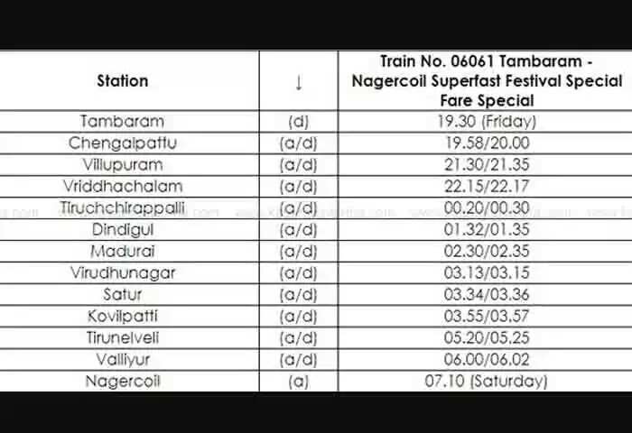താംബരത്ത് നിന്ന് നാഗർകോവിലിലേക്കുള്ള (06061) പ്രത്യേക ട്രെയിൻ നവംബർ 10, 17, 24 തീയതികളിൽ രാത്രി 7.30ന് താംബരത്ത് നിന്ന് പുറപ്പെടും. പിറ്റേന്ന് രാവിലെ 7.10ന് നാഗർകോവിലിലെത്തും. ഈ ട്രെയിനാണ് മംഗ്ളൂറിലേക്കും തുടർന്ന് താംബരത്തേക്കും സർവീസ് നടത്തുന്നത്.