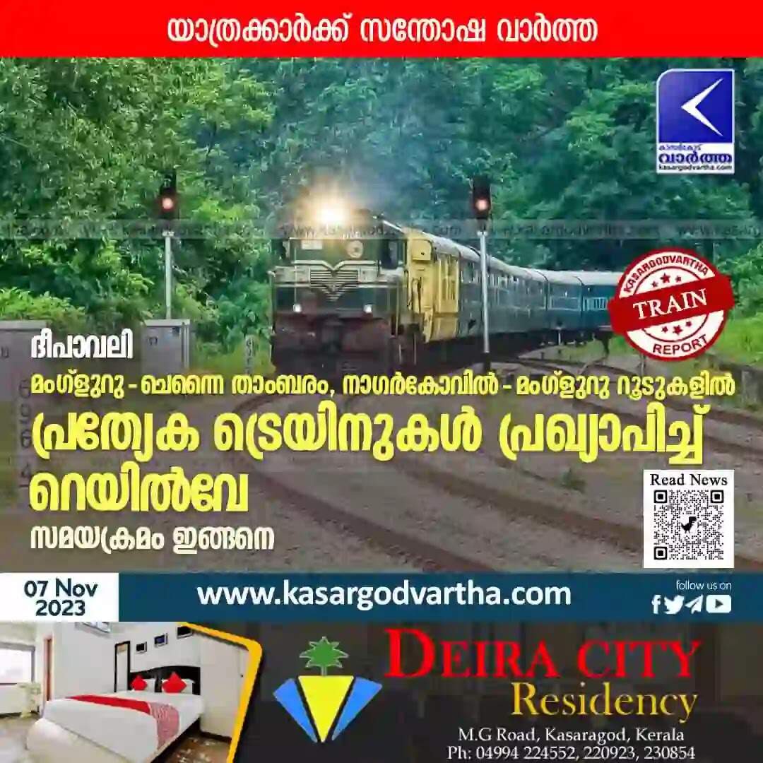 Train | ദീപാവലി: മംഗ്ളുറു - ചെന്നൈ താംബരം, നാഗർകോവിൽ - മംഗ്ളുറു റൂടുകളിൽ പ്രത്യേക ട്രെയിനുകൾ പ്രഖ്യാപിച്ച് റെയിൽവേ; സമയക്രമം ഇങ്ങനെ
