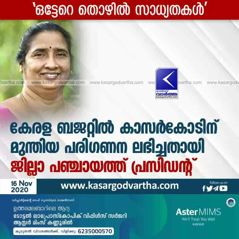 കേരള ബജറ്റില് കാസർകോടിന് മുന്തിയ പരിഗണന ലഭിച്ചതായി ജില്ലാ പഞ്ചായത്ത് പ്രസിഡന്റ്