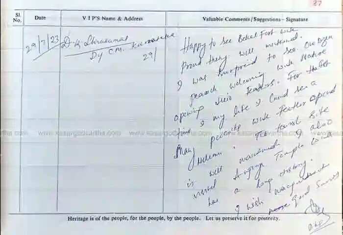 കർണാടകയിൽ ഭരണം തിരിച്ചുപിടിക്കാൻ ഒന്നര വർഷത്തോളം വിശ്രമം പോലും ഇല്ലാതെ മുഴുവൻ സമയ രാഷ്ട്രീയ പ്രവർത്തനത്തിൽ മുഴുകിയ ഡി കെ അൽപം വിശ്രമത്തിനായാണ് ബേക്കലിലെത്തിയത്. രണ്ട് ദിവസം ബേക്കലിൽ തങ്ങിയ ഡി കെയും കുടുംബവും സുഹൃത്തുക്കളും മറ്റ് പരിപാടികളിലൊന്നും സംബന്ധിക്കാതെ താജിൽ തന്നെ അവധി ആഘോഷിച്ചു. ബേക്കൽ കോട്ട കാണാനെത്തിയ അദ്ദേഹം കോട്ടയും പ്രകൃതി ഭംഗിയും കടൽക്കാഴ്ചയും മയിൽക്കൂട്ടം പീലി വിടർത്തിയതും കാണാനായതിൽ സന്തോഷം പ്രകടിപ്പിച്ചു. ജീവിതത്തിൽ ആദ്യമായാണ് ഒരുകൂട്ടം മയിലുകൾ ഇത്തരമൊരു വിരുന്നൊരുക്കിയതെന്നും കോട്ടയിലെ രജിസ്റ്ററിൽ സന്ദേശം കുറിച്ച് കൊണ്ട് അദ്ദേഹം വ്യക്തമാക്കി.