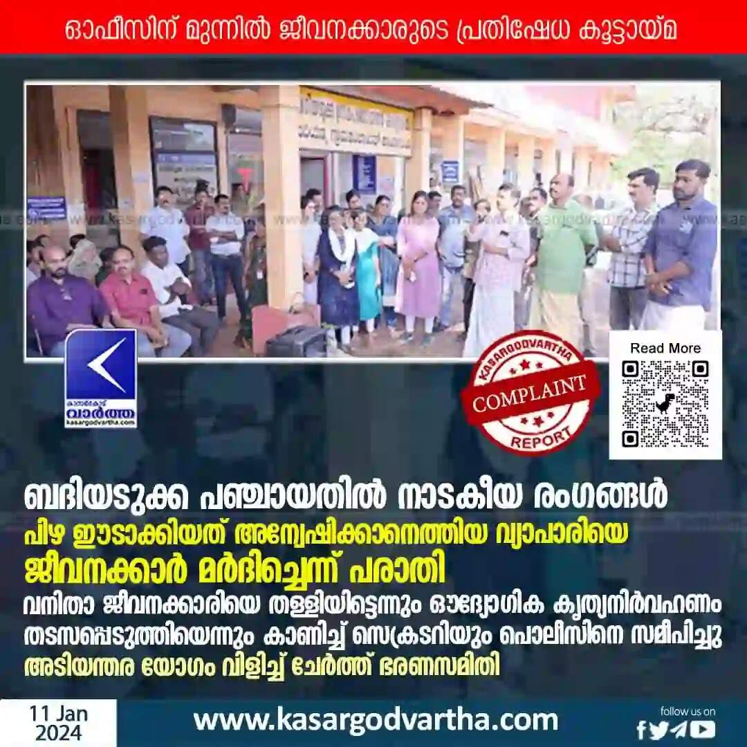 അതിനിടെ, ബദിയടുക്ക പഞ്ചായത് ജീവനക്കാർക്ക് ഓഫീസുകളിൽ നിർഭയമായി ജോലി ചെയ്യാനുള്ള സൗകര്യമുണ്ടാകണമെന്ന് ജീവനക്കാരുടെ സംയുക്ത പ്രതിഷേധയോഗം അധികൃതരോട് ആവശ്യപ്പെട്ടു. മാലിന്യ പ്രശ്നവുമായി ബന്ധപ്പെട്ട് വ്യാപാരികൾക്ക് നൽകിയ നോടീസുമായി ഉണ്ടായ പ്രശ്നത്തിൽ ജീവനക്കാർ ഓഫീസ് നടപടിയുടെ ഭാഗമായാണ് പ്രവർത്തിച്ചതെന്നും അതിൻ്റെ തുടർ നടപടികളുമായി മുന്നോട് പോകുമ്പോൾ ജീവനക്കാരുടെ മനോവീര്യം തകർക്കുന്ന നടപടികൾ അവസാനിപ്പിക്കണമെന്നും പഞ്ചായത് ഓഫീസിന് മുന്നിൽ നടന്ന പ്രതിഷേധ കൂട്ടായ്മ ആവശ്യപ്പെട്ടു. കെജിഒഎ ജില്ലാ സെക്രടറി കെ വി രാഘവൻ, എൻ ജി ഒ യൂണിയൻ ജില്ലാ സെക്രടറിയേറ്റംഗങ്ങളായ എ വേണുഗോപാലൻ, പി ഡി രതീഷ്, കെ വി മനോജ് എന്നിവർ യോഗത്തിൽ സംസാരിച്ചു.